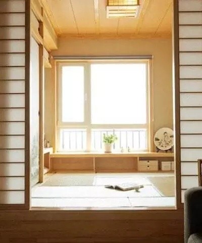 在日式空间的小阳台上,没有什么多余的装饰,简单的一个木质的小桌子贯穿整个小阳台区域,桌板上面,可以摆放上绿色植物,下方则是收纳区,大大增加了阳台的存储空间。