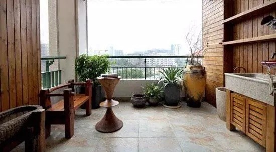 宽敞的阳台全用木质打造,木质的收纳墙、木质座椅、饰品、桌子等,古色古香的木色,让阳台更加贴近大自然,统一的风格也很美观。