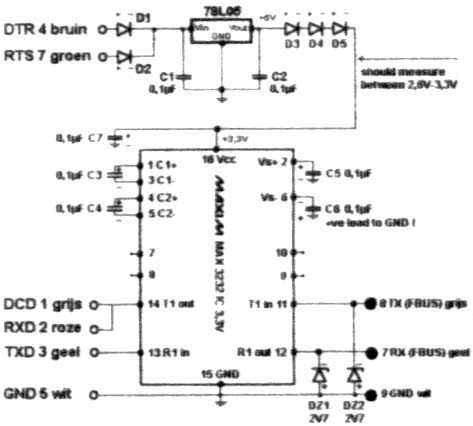 1.所需元件:IC为MAX232(串行接口集成块,约15元,电脑IC配件都有销售)、C1 和 C2 是 0.1μF瓷片电容. C3 到 C7 是 0.1μF 电解电容。D1 和 D2 二极管型号是1N4148、 D3、D4 和 D5 是 1N4001 二极管,作用将电压从5V降到3V。DZ1 和 DZ2 是阻尼二极管,压降为 2.7V,用来保证 Nokia TX 和 RX 数据线的最大极限电压在 2.7V,用来保护手机。所有的电容要求最小耐压 16V。稳压IC78L05的引脚在平面对上、引脚对自己从左到右依次为5V电压输出、地、电压输入。串口DB9针式连接头的编号 (1 to 9) 见插座上的标注。MAX232 芯片 1 脚位于芯片上有小圆点标记的下方。所需手机接口不易购买,可以用充电器插头(即火牛)或手机免提连线插头代替,价格非常便宜。