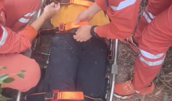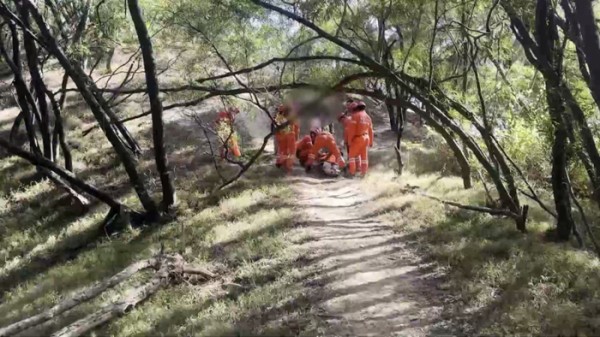 当时这名女子坐在地上,左腿脚踝处扭伤,无法站立行走。给女子进行简单包扎固定后,救援队员用担架抬着女子,向山下转移。