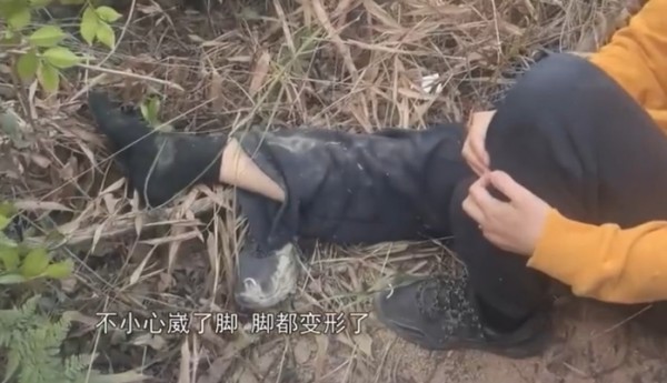 女子爬山滑倒崴伤脚