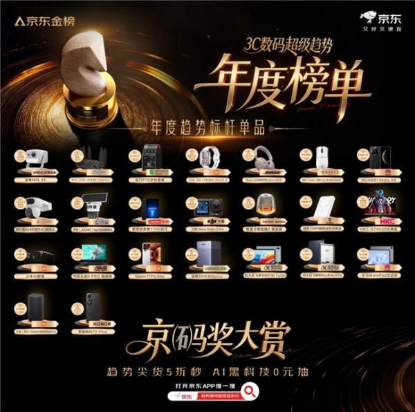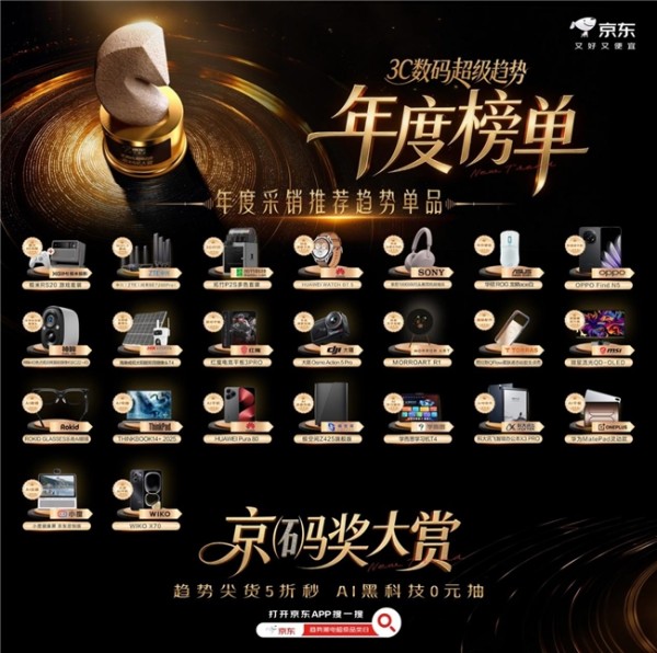 京东还隆重揭晓了“京码奖大赏”年度榜单,从海量产品与品牌中遴选出一批深刻契合年度趋势、并赢得市场与用户双重认可的标杆力量。本次3C数码超级趋势年度奖项联合京东金榜评选而成,京东金榜作为消费者认知度、使用体验和购买满意度显著领先行业的权威榜单,依托销售、口碑等动态数据构建严苛评选体系,更体现出获奖单品与品牌的趋势引领作用。