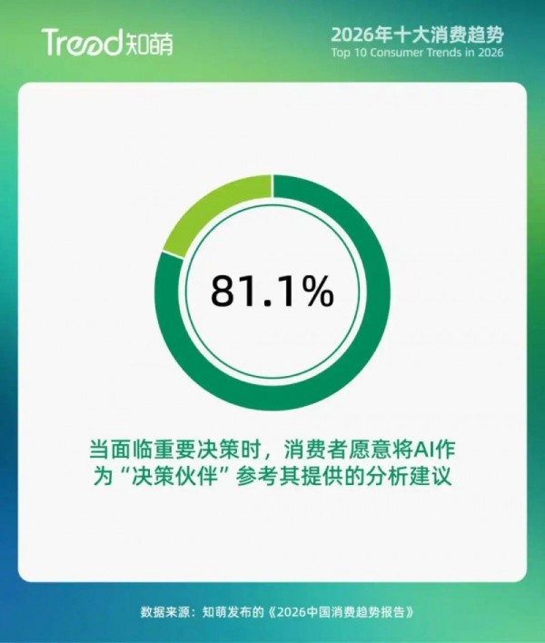 在消费决策中,AI正在成为购物前的“必问对象”。当消费者面对信息高度冗余、评价彼此矛盾的市场环境时,AI提供了低成本、高效率的理性参考方式。知萌趋势研究显示,超过八成消费者在做消费决策前,会先向AI询问测评、对比优劣、筛选性价比,再进入具体平台比价下单。AI不再只是推荐商品,而是深度介入消费者的“决策前链路”,成为理性判断的重要一环。
