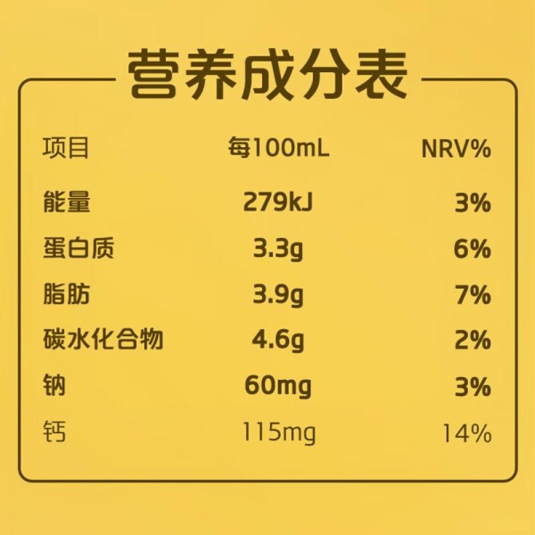 丰富营养成分:每100mL牛奶中含有3.6g优质蛋白质,提供全面营养支持。这款产品完美适合家庭饮用,特别是儿童和老人,提高身体抵抗力,满足日常所需。无论是做早餐麦片、烘焙食材,还是直接饮用,这股浓郁的滋味都能让你的每一天活力充沛。