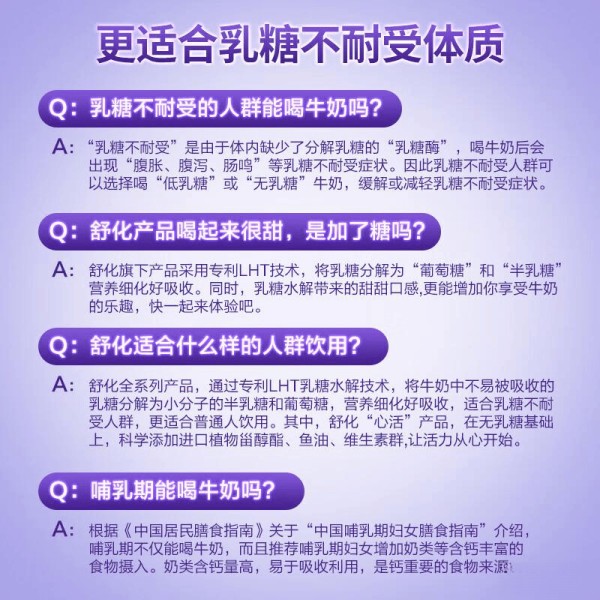 无乳糖配方设计:特别为乳糖不耐受的家庭成员打造,避免了肠胃不适的烦恼。适合全家共同享用,美味又无负担,能够让每一个人都能畅快享受牛奶的美味与营养,是日常饮食中理想的选择。