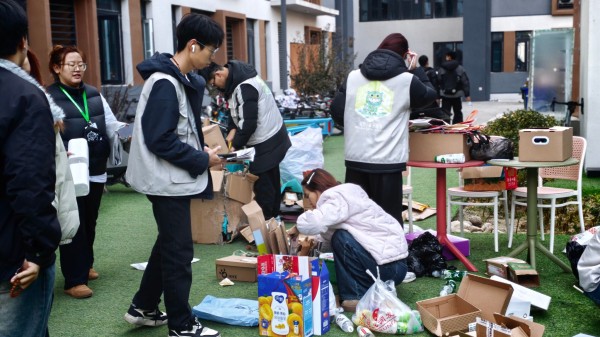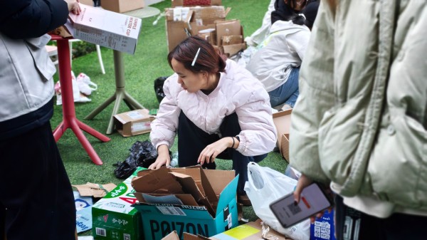 活动当天,工作人员早早布置好回收点位,清晰的分类区域让每件旧物都能“对号入座”。秋意微凉,现场却暖意融融。同学们三三两两结伴而来,有的手提叠放整齐的旧衣,有的抱着捆扎结实的纸箱,还有的拎着沉甸甸的塑料瓶,一步步走向回收点,也仿佛一步步走向更绿色的明天。工作人员默契配合,细心分拣、整理、打包,还不忘在同学搬运大件物品时快步上前搭把手。这一递一接之间,流淌的是理解,也是共同为环保出力的温暖。敢当书院/大数据学院的赵凤钏分享道:“知道这些旧物会变成生日会的装饰,感觉特别有意义!既解决了储物难题,又为一场温暖的聚会贡献了力量。”