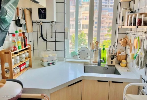 厨房的窗台正常是比橱柜高一些的,但高出的这一部分,相对来说能摆放的空间就缩小了很多,放多了还会显得凌乱,把厨房窗台下落到和台面齐平,橱柜台面直接延伸出去,毫无违和感,视觉上看起来更宽更利落,而且减少卫生死角,给卫生清洁带来方便,最大的好处是拓展了厨房台面的空间,刷碗洗菜更宽敞。