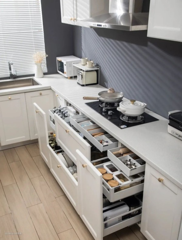 客观条件有限,我们可以想办法拓展空间,这样橱柜内部也能做到井井有条,台面上更干净整洁。