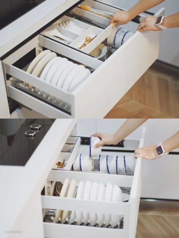 我们可以利用橱柜内部的高度差,增加一层工具内抽,单层变成双层,提升空间利用率,分格的位置可以收纳一些零碎的小工具,比如开瓶器、打蛋器、磨刀石和利用率不高的刀具等,做干湿分区和独立餐盘,这样更方便了也更卫生。
