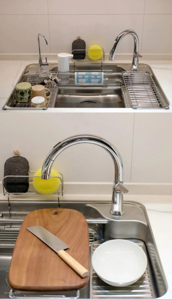 厨房水槽选不好,浪费空间,还不实用,大个的单水槽可以一边洗菜,一边切菜,尤其很适合小面积的厨房,水槽上面放上砧板就可以切菜,上中下三层的隔板沥水架也非常好用,好收纳,在这个空间里,各种配件自由搭配,一槽多用,可以同时完成食材处理和清洁洗刷