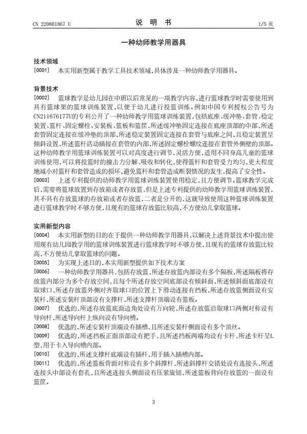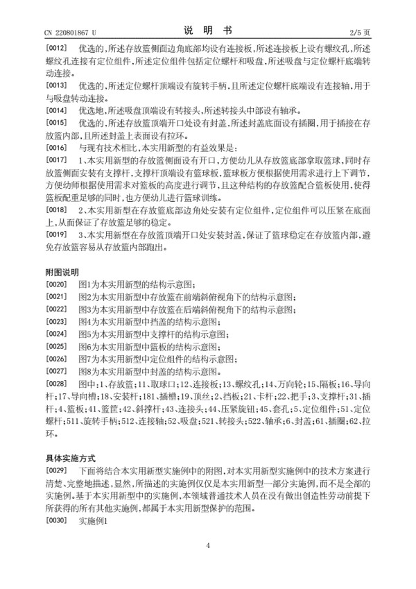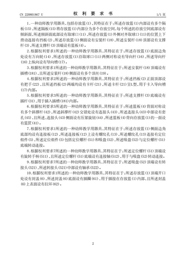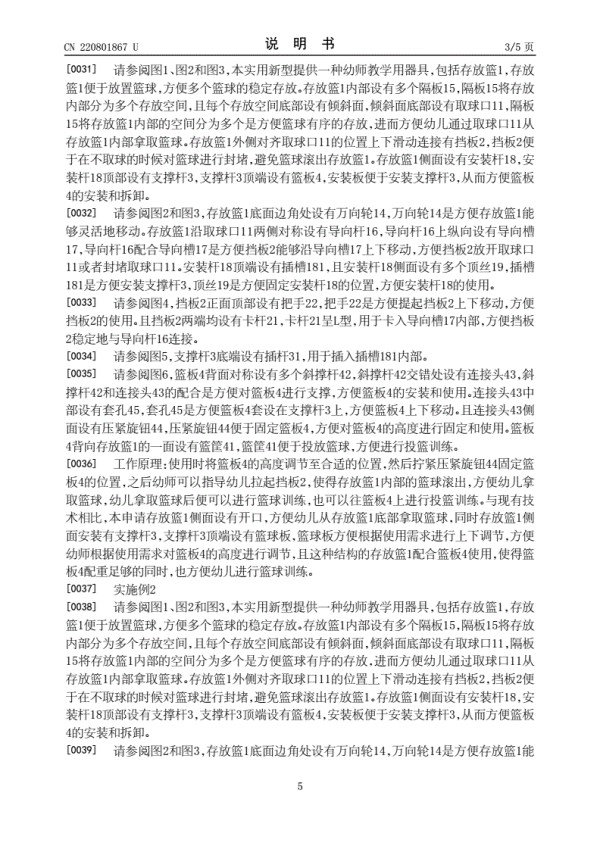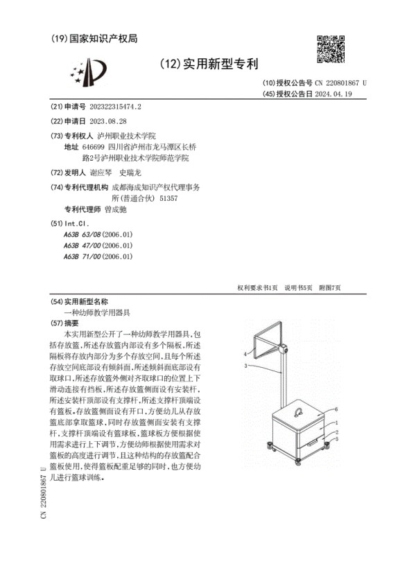 申请专利号:CN202322315474.2 公开(公告)日:2024-04-19 公开(公告)号:CN220801867U 申请人:泸州职业技术学院摘要:本实用新型公开了一种幼师教学用器具,包括存放篮,所述存放篮内部设有多个隔板,所述隔板将存放内部分为多个存放空间,且每个所述存放空间底部设有倾斜面,所述倾斜面底部设有取球口,所述存放篮外侧对齐取球口的位置上下滑动连接有挡板,所述存放篮侧面设有安装杆,所述安装杆顶部设有支撑杆,所述支撑杆顶端设有篮板。存放篮侧面设有开口,方便幼儿从存放篮底部拿取篮球,同时存放篮侧面安装有支撑杆,支撑杆顶端设有篮球板,篮球板方便根据使用需求进行上下调节,方便幼师根据使用需求对篮板的高度进行调节,且这种结构的存放篮配合篮板使用,使得篮板配重足够的同时,也方便幼儿进行篮球训练。
