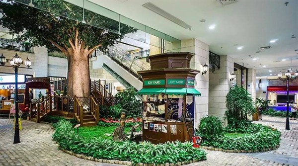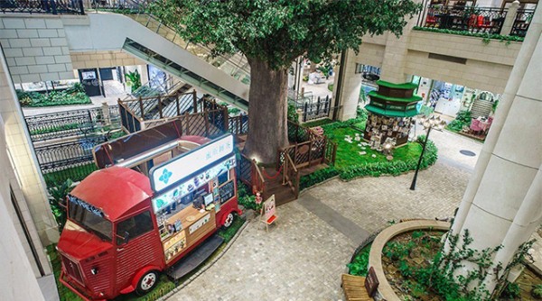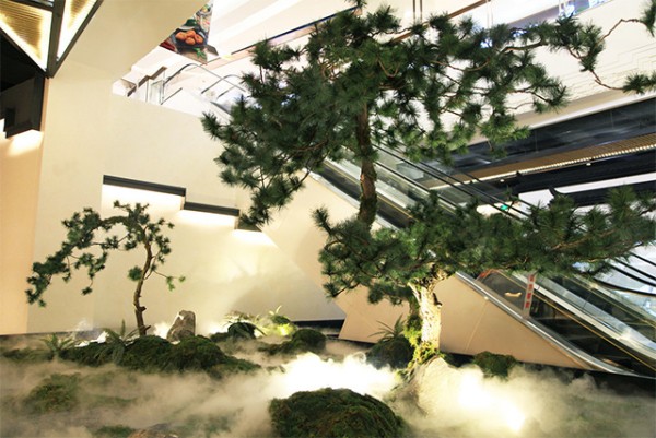 原木、绿植、水系、石材等自然元素的大量使用,将自然从室外延伸至悦界。中央公园中生长着一株永生榔榆树。这株高10米、直径1.5米的榔榆树经过水分子置换工艺的处理,保留了其原生状态,是目前国内商业项目中采用的最大永生植物,也成为悦界地标性的象征。悦界中使用的绿藻青苔也均为国内商业首次使用的永生植被,既保留了植物原生的色泽、形态,同时便于景观的保存及清理。
