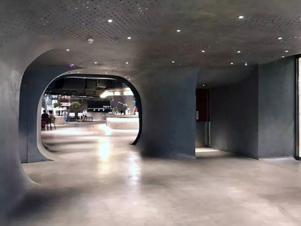 不同于悦界的绿色自然和拾间的徽派新中式,伍台的整个空间设计颇有未来感,充满太空舱的氛围。不管是各种形状不同大小的镜面及玻璃装饰的虚实折射,水泥石材中透过的大小不一、色彩各异的圆形灯光营造,还是带有延伸感的弧形隧道的设计,无不体现着这种感觉,使得消费者一进入这个空间便会产生“好玩的事情即将发生”的预先刺激感。