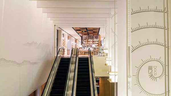 度刻入口处的电梯两边悬挂透光纱绢,一边是带有刻度的各种创意图案,比如卷尺、温度计、还有钟表盘,突出时间的概念。另一侧则是运用国人独特审美符号的山水画为主,增加了特殊设计所聚合而成的光晕散落下来。