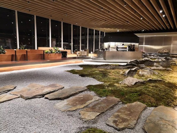 除了永生植物,“悦界”大体量地使用了绿植园艺装饰,植物覆盖率高达35%,水系、石桥相间其间,营造安静舒适的氛围。公区灯光采用HID投影技术,模拟四季昼夜的光影变化,形成自然环境中的明暗生趣。