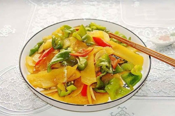 3. When the potato slices change color, add green peppers and stir-fry;