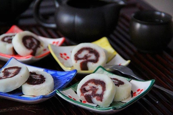 6. Spread the bean paste filling flat on the yam puree, and slowly roll up the yam paste;