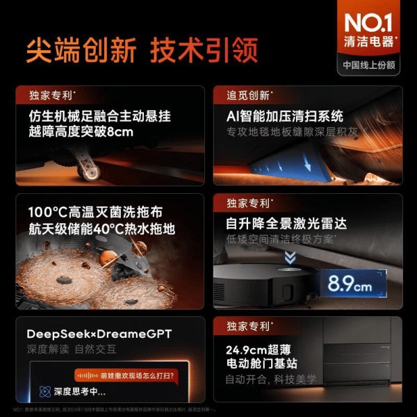 超强清洁能力:采用100℃高温灭菌科技,99.99%的除菌率让重油污迎刃而解,家庭厨房和餐厅的卫生清洁变得更加轻松。 智能导航技术:配备自升降激光雷达,具备6cm越障能力,能顺利跨越各种障碍,确保每一寸区域都能被清洁到位。 强力吸尘设计:双滚刷技术与24000Pa大吸力相结合,让地毯与地板的清洁效果大幅提升,深层清洁不再是难题。 便捷自清洁系统:高温喷淋技术让清洁设备保持最佳状态,轻松维护省去繁琐步骤,使用体验更为便捷。 适合人群:非常适合忙碌的家庭,尤其是有宠物的用户,无需担心清理宠物毛发和污垢,让家中的每一个角落都焕然一新,真正做到轻松清洁。