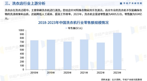 洗衣店在洗衣过程中,主要依赖洗衣机进行清洗,但也会针对特殊衣物采用手洗清洁,而且专业的洗衣机不仅能确保衣物的洗涤效果和品质,还能降低人工成本、提高工作效率。2023年,洗衣机全渠道零售量为4005万台,零售额为934亿元。