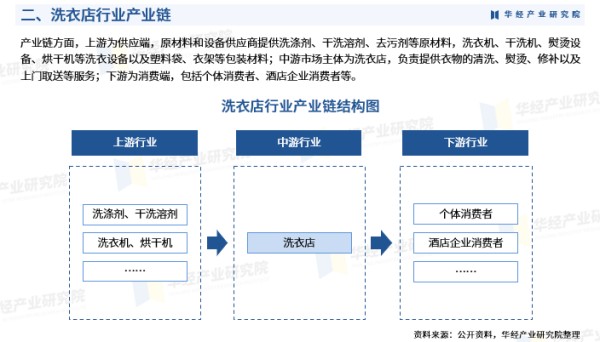 产业链方面,上游为供应端,原材料和设备供应商提供洗涤剂、干洗溶剂、去污剂等原材料,洗衣机、干洗机、熨烫设备、烘干机等洗衣设备以及塑料袋、衣架等包装材料;中游市场主体为洗衣店,负责提供衣物的清洗、熨烫、修补以及上门取送等服务;下游为消费端,包括个体消费者、酒店企业消费者等。