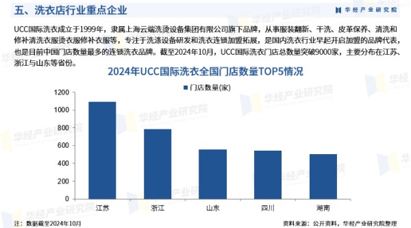 UCC国际洗衣成立于1999年,隶属上海云端洗烫设备集团有限公司旗下品牌,从事服装翻新、干洗、皮革保养、清洗和修补清洗衣服烫衣服修补衣服等,专注于洗涤设备研发和洗衣连锁加盟拓展,是国内洗衣行业早起开启加盟的品牌代表,也是目前中国门店数量最多的连锁洗衣品牌。截至2024年10月,UCC国际洗衣门店总数量突破9000家,主要分布在江苏、浙江与山东等省份。