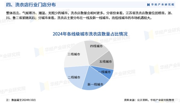 整体而言,气候寒冷、潮湿、光照少的城市,洗衣店数量会相对更多。分省份来看,江苏省洗衣店数量位居榜首,浙、川、鲁三省紧随其后;分城市来看,洗衣店主要分布在一线及新一线城市,而低线城市的市场机遇较大。