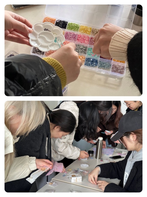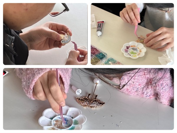 经过近两小时的精心制作,原本零散的材料在同学们手中化身为一件件独具匠心、光 泽温润的螺钿胸针或饰品。看着自己亲手完成的艺术品,参与者们纷纷展示作品,脸上洋 溢着成就与喜悦。