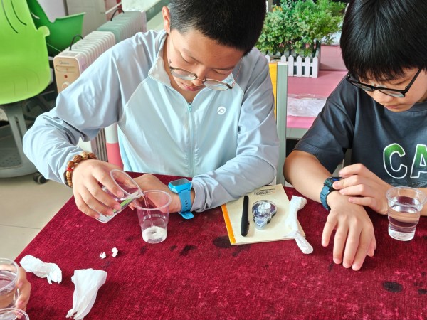“科学实验室”聘请专业科学实验讲师,以“从生活到科学”为主线,展现物质特性、能量变化、力学原理等多领域知识。“不一样的冰”通过亲手制作非牛顿流体冰,观察其在外力作用下的形态变化,从干冰烟雾实验直观感受升华现象;“水去哪儿了”结合蒸发、毛细现象等原理,对比不同温度下水的蒸发速度,用纸巾与土豆探究水分传输规律;“自制小火箭”利用塑料瓶、水与打气筒组装水火箭,在发射实验中理解反作用力与空气动力。在实验导师的带领下,孩子们通过动手实践,将抽象的科学原理变得可知可感,在动手操作中提升观察分析能力,在现象探究中培养科学思维,更发现了“厨房、阳台都是实验室”的生活智慧。