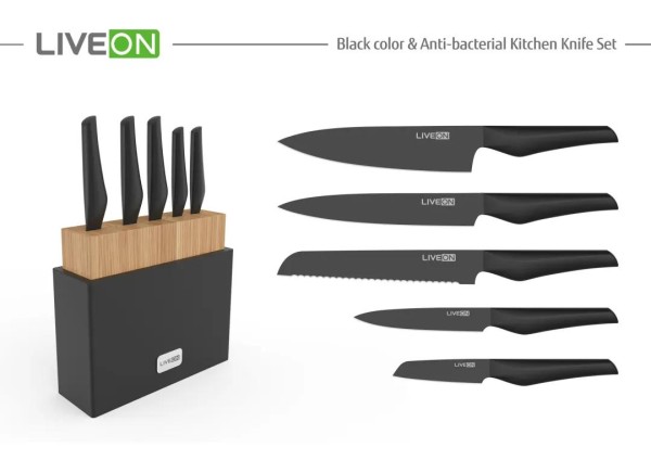 刀具套装包括:8" 厨师刀、8" 切片刀、8" 面包刀、5" 万用刀、3.5" 削皮刀、收纳刀座,可满足日常切割需求。刀具符合人体工学,手柄由前向后渐大的造型能提供很好的抓握力,不易脱手,适合各种手形, 切割省力,减少手腕疲劳。
