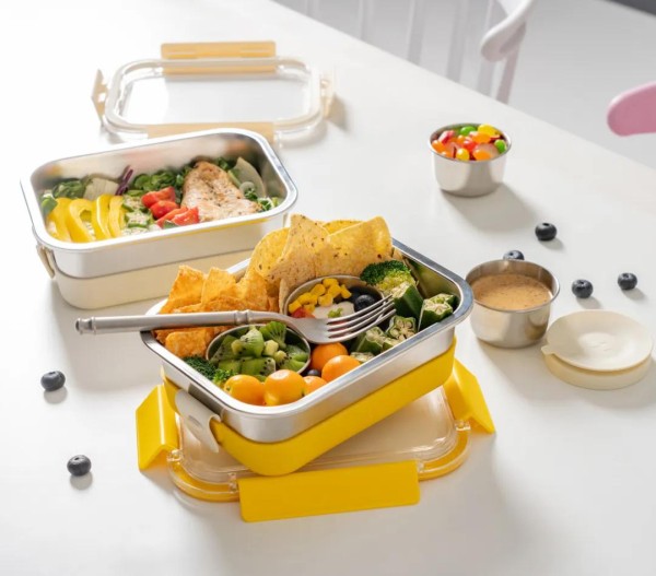 时尚的产品设计展现了刚柔并济的感觉,确保了在微波炉中的安全使用。它还配备了一个独立的酱汁盒,可以放在午餐盒里放酱汁、坚果或任何其他零食。独特的吸盘盖设计,使酱汁盒能够轻松吸附在餐盒盖的内侧,避免了两个不锈钢容器相互碰撞的恼人声音,让您的通勤之旅得以平静轻松地度过。