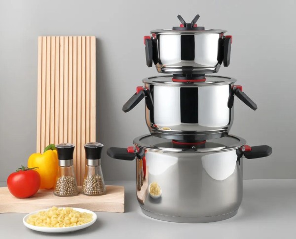 新潮舒适的折叠煲系列设计,几何流线变化使得配件可折叠的同时更加符合人机工程学,整体造型新潮方便,符合现代人生活的美学。不同的配件材质,让消费者更加自由选择。不同材质体现不同质感,电木材料轻便舒服耐热,不锈钢材质健康环保更耐用;手握柔和手感漆的配件煲耳,加上闪亮的镜光工艺,更凸显出产品的高精致高品质。层叠式收纳折叠煲组合设计,可分类摆放,也可组合折叠一体式摆放,解决厨房收纳问题,节省空间。电木配件的巧妙设计,多功能的同时融合较少产品的部件,降低生产成本。可折叠的电木配件融入煲的整体,节省空间的同时还可以适用于各种不同使用环境,也能最大化的减小包装体积以及运输成本。