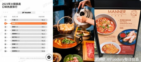 除了火锅,酸汤也在入侵别的品类,酸汤烤鱼、酸汤水饺、酸汤叶面......连咖啡品牌Manner也凑起了热闹,推出了贵州酸汤海鲜泡饭。