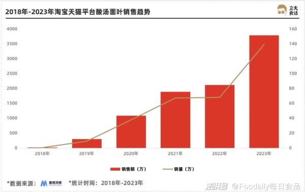 以酸汤面叶为例,根据魔镜洞察的统计数据,2023年酸汤面叶的销售额约3800万,相比2018年翻了165倍。