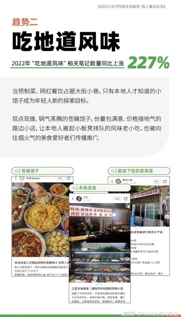 《2023小红书年度生活趋势》报告显示,2022年“吃地道风味”相关笔记数量同比上涨227%,只有本地人才知道的小馆子成为年轻人新的探索目标。