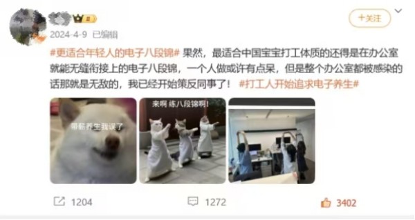 线上话题热度的持续攀升也在带动线下群体的积极参与。有趣的跟练合拍和打卡活动,正吸引越来越多打工人加入办公室“健身”行列。在工区,团队同事间会在固定时间内集体跟练八段锦,并将这一场景拍照上传至平台,配以幽默表情包,作为带薪养生的欢乐日常在云端分享,形成线上线下联动的传播闭环。