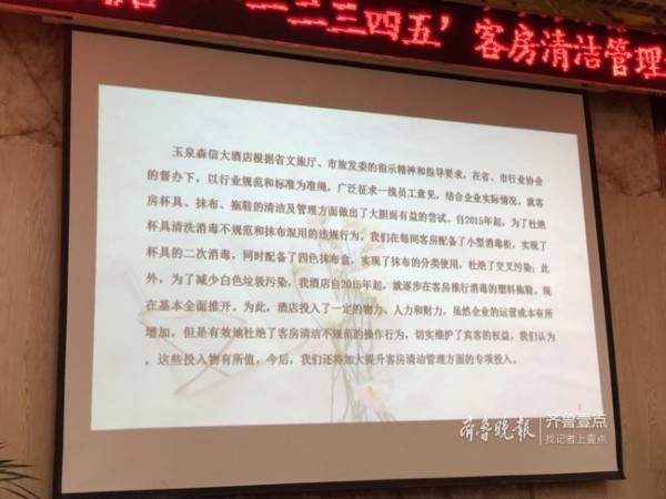 1月16日,为加强酒店行业内部自律、加大外部监管和惩处力度,让消费者真正住的放心、住的安心,济南玉泉森信大酒店举行“‘一二三四五’客房清洁管理法”汇报会。