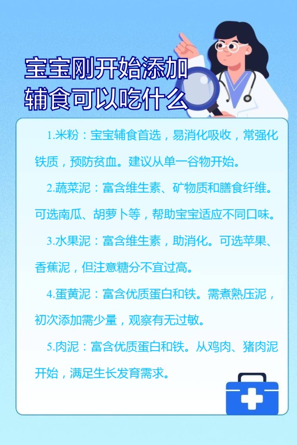 宝宝刚开始添加辅食可以选择米粉、蔬菜泥、水果泥、蛋黄泥、肉泥等。