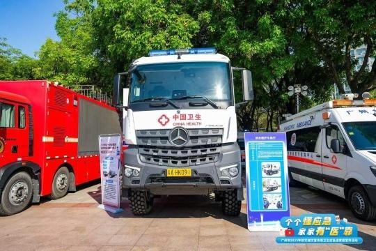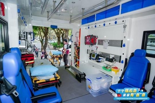 活动现场还展出了广州市红十字会医院配备的、全省目前唯一一台涉水深度可达1.5米以上的全地形越野救护车。该院医务科科员谢浩贤介绍,全地形越野救护车可以在极端恶劣环境下进行行驶救援,保证医务人员能够及时到达事故现场、快速提供医疗救援服务,“整车的设计,包括医疗舱、驾驶舱离地高度都在1.5米以上,车身四周都有摄像头,便于驾驶员观察周围情况;电动尾板可以将电动担架抬高,即使在比较严重的水灾中也可以将病人抬到医疗舱的位置进行转运,最多可以转运5个病人。车上还配置了5G会诊系统,有需要的情况下在转运过程中就可以通过屏幕连线到专家会诊。”