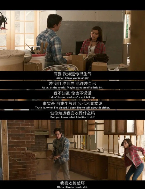 丽兹与艾丽大吵一架后,皮特没有不问缘由的对丽兹进行惩戒,而是将她带到自己正在装修改造的旧房子里,让她尽情打砸、肆意发泄。