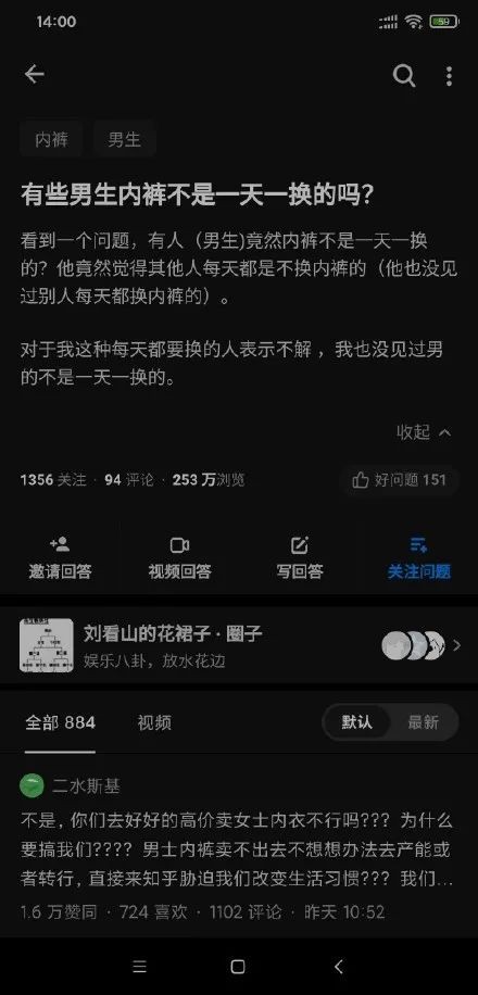 起因是一个女网友发问:男生的内裤不是该一天一换吗?