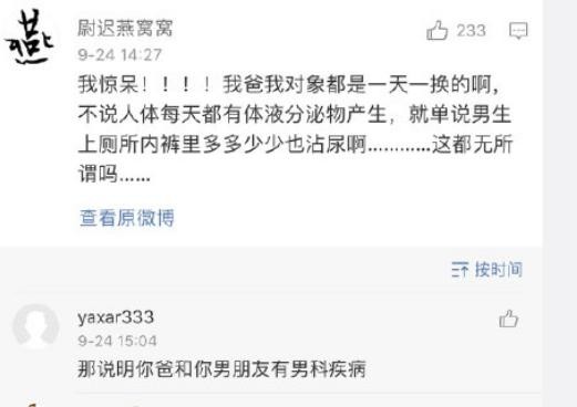女生说自己的爸爸和对象,内裤都是一天一换,结果有网友回复她:那说明你爸和你男朋友有男科疾病(才会内裤一天一换)。
