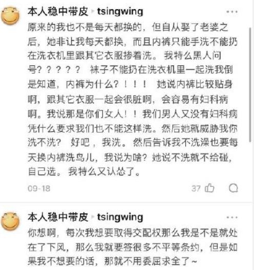 还有这个,埋怨自己的老婆改变了自己的生活习惯,但为了能跟老婆那啥,他不得不听从。