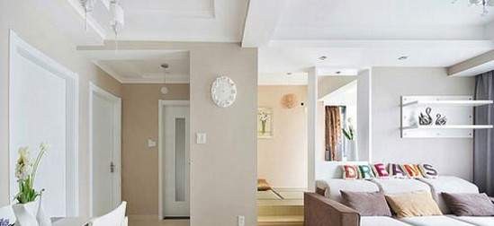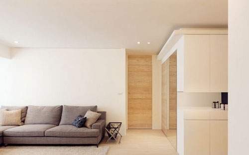 案例中客厅正对着玄关,同时算是位于整个空间的后半段,由于是小户型,所以就没必要摆放过多的家具及装饰。简易的布艺沙发以及简单的地毯就会是不错的搭配。整个色调上给人舒适感。