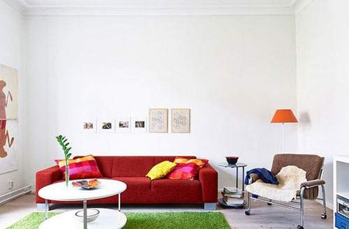 客厅主体部分,红色的沙发和绿色的地毯搭配出灿烂、明快的感觉,同时这两种色彩和红花绿叶特别接近,所以自然气息也相应流露出一点。沙发边桌和茶几都很简单,下方收纳,上方放置物品。后方橙色的落地灯也很抢镜头。