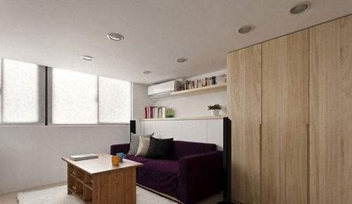 低矮的屋顶决定了卧室的高度,紫色和白色空间已经木色家具的搭配很符合简约风格。为整个空间量身定制的柜子是很不错的小户型收纳,沙发后方的搁架和空调完美的结合在一起,能放下不少书籍和小杂物。