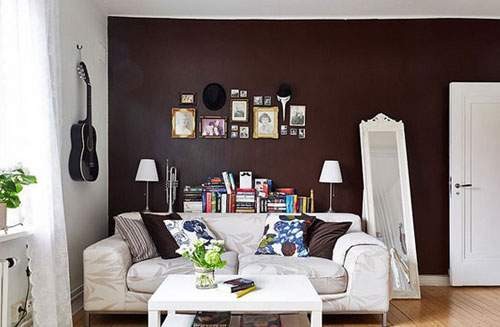 空间不够大无法做过多的延展,那么就只能在精巧上下工夫了。褐色和白色两种对比明显的色调用到狭小的客厅中无疑能吸引住目光,同时还能在无形中增大空间的作用。一面穿衣镜放在沙发边实用美观都不错。