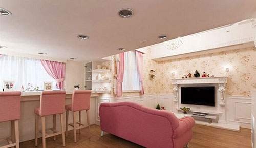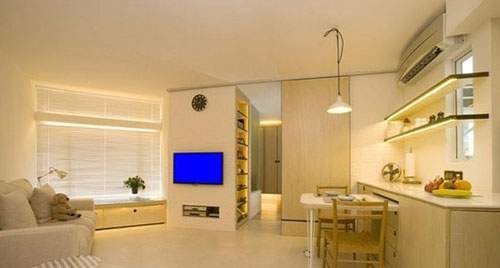 客厅最重要的就是沙发和电视背景墙的设计,简单的双人沙发虽然比较小,但对小空间来说绰绰有余了。电视背景墙也仅仅是在墙上做了些许的装饰,上方搁架样式的设计能放下不少装饰物。