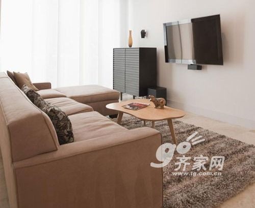 小空间里,越少的家具越能给人宽敞的视觉。只要一个大大的沙发,搭配一个圆滑的木质小茶几,这个沙发区宽敞又舒适。挂墙的液晶电视也为地面减轻了负担,旁边的木质收纳柜可以放些常用的客厅用品。这样,一个简洁明快又素雅的客厅就形成了。不过,这样的设计不太适合杂物太多的家庭。