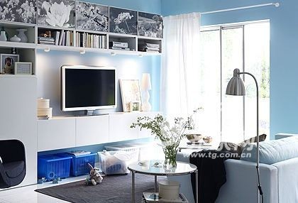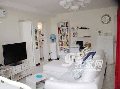 如果家里的小东西很多,无论是哪个角落,都不可忘记收纳,而客厅更是承担收纳大任。将客厅里的电视柜、书柜、小茶几等家具都与收纳挂钩,适当的墙面搁架也可以帮忙,这样,整个客厅整洁大方,也就没有小户型客厅的局促感了。墙面和家具、布艺软装都统一白色,让空间显得明亮。