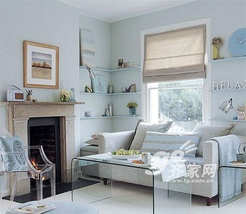 极简设计的倒“U”字形玻璃茶几和沙发边柜既拥有实用功能,同时又不让沙发区显得拥挤。配套的透明材质单椅也有同样的效果。温和的淡蓝色墙面和淡雅的布艺沙发也是小客厅的好挑选。